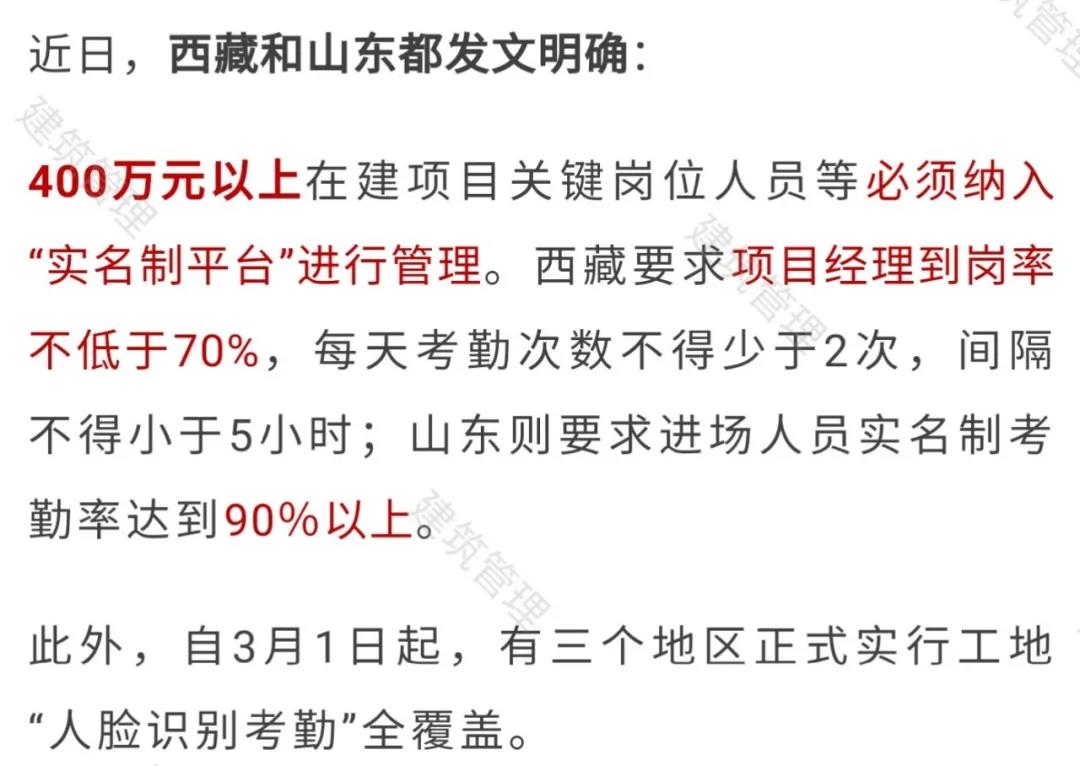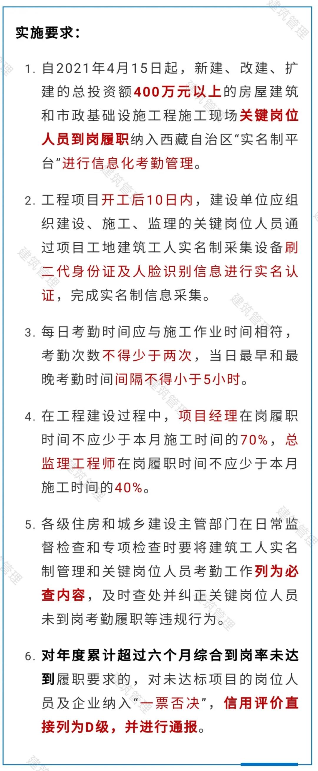 自2021年4月15日起,凡在我區(qū)行政區(qū)劃內(nèi)新建、改建、擴建的總投資額400萬元以上的房屋建筑和市政基礎(chǔ)設(shè)施工程施工現(xiàn)場關(guān)鍵崗位人員到崗履職納入“西藏自治區(qū)建筑工人實名制管理平臺”(以下簡稱“實名制平臺”)進行信息化考勤管理。